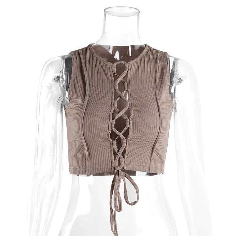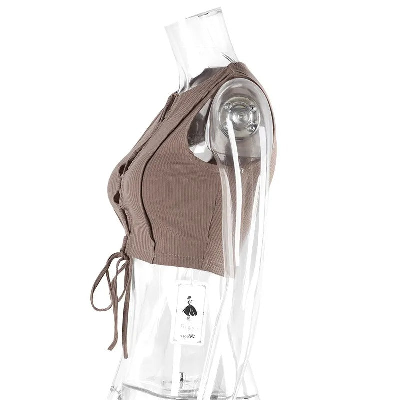 Este top sin mangas para mujer presenta un diseño de corte crop con tejido canalé elástico que se ajusta suavemente al cuerpo. El detalle frontal cruzado con cordones ajustables no solo estiliza la silueta, sino que añade un toque distintivo y contemporáneo a cualquier conjunto.