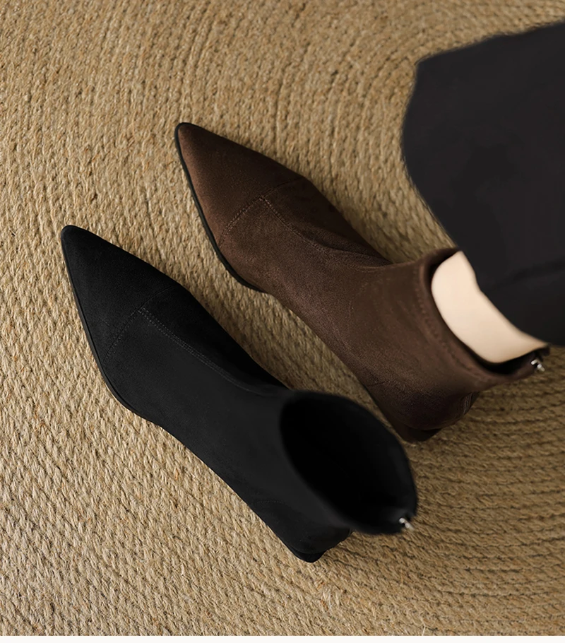 Nuestros refinados botines Claudia son un favorito porque combinan la suavidad del ante con una silueta minimalista diseñada para el uso diario elegante. Su diseño tipo calcetín abraza el tobillo con delicadeza sin cremalleras ni costuras visibles, mientras que el tacón bajo proporciona un ligero realce manteniendo comodidad absoluta durante todo el día. La textura aterciopelada del ante añade sofisticación discreta y calidez.