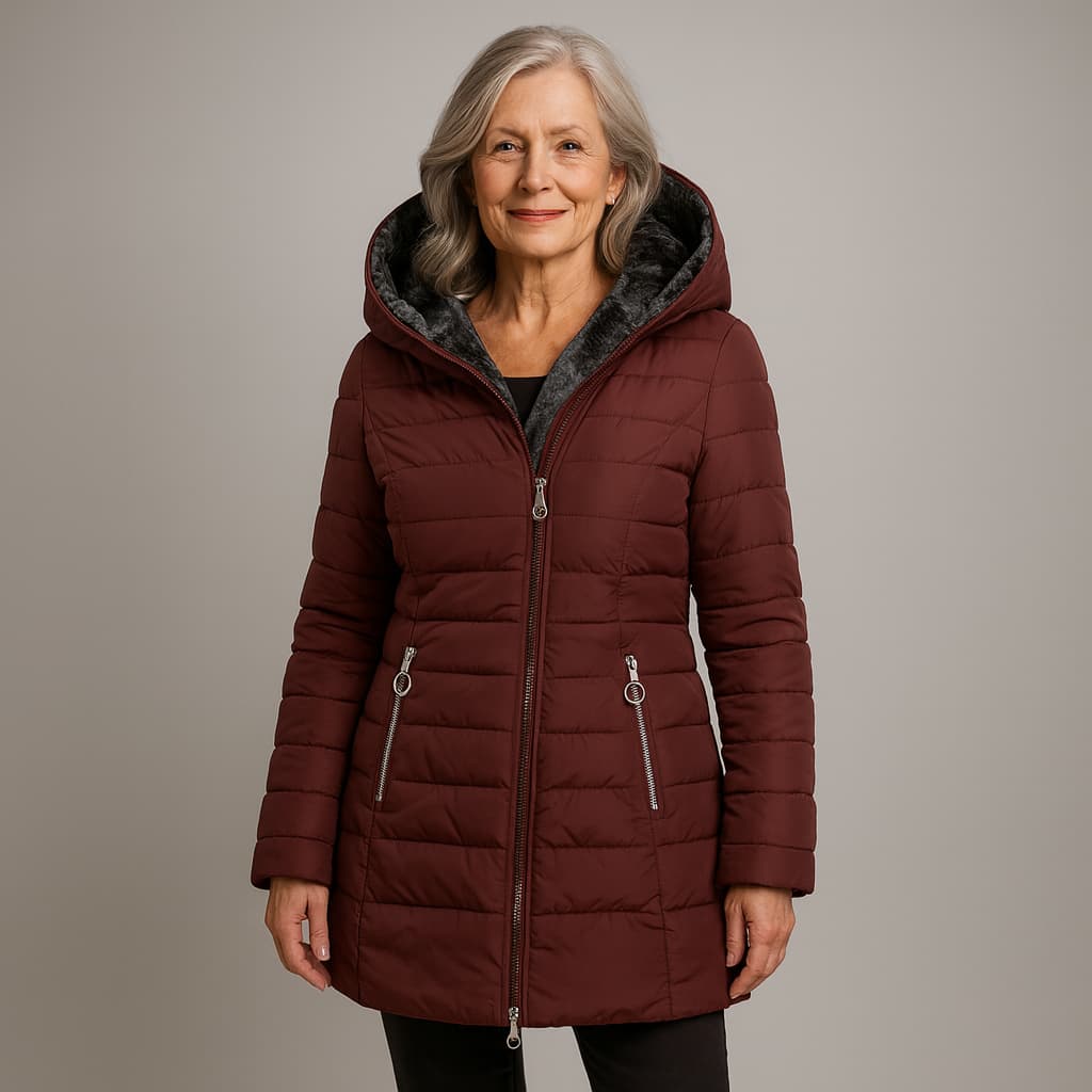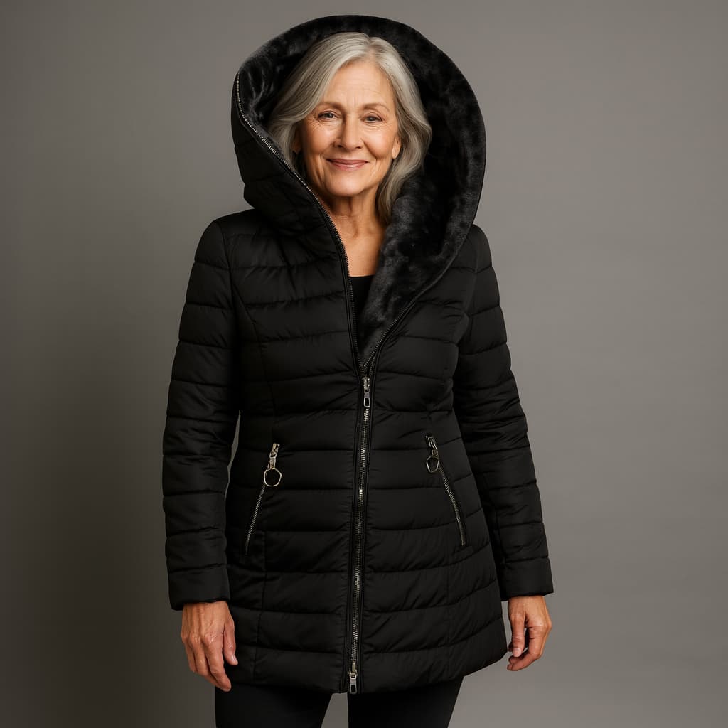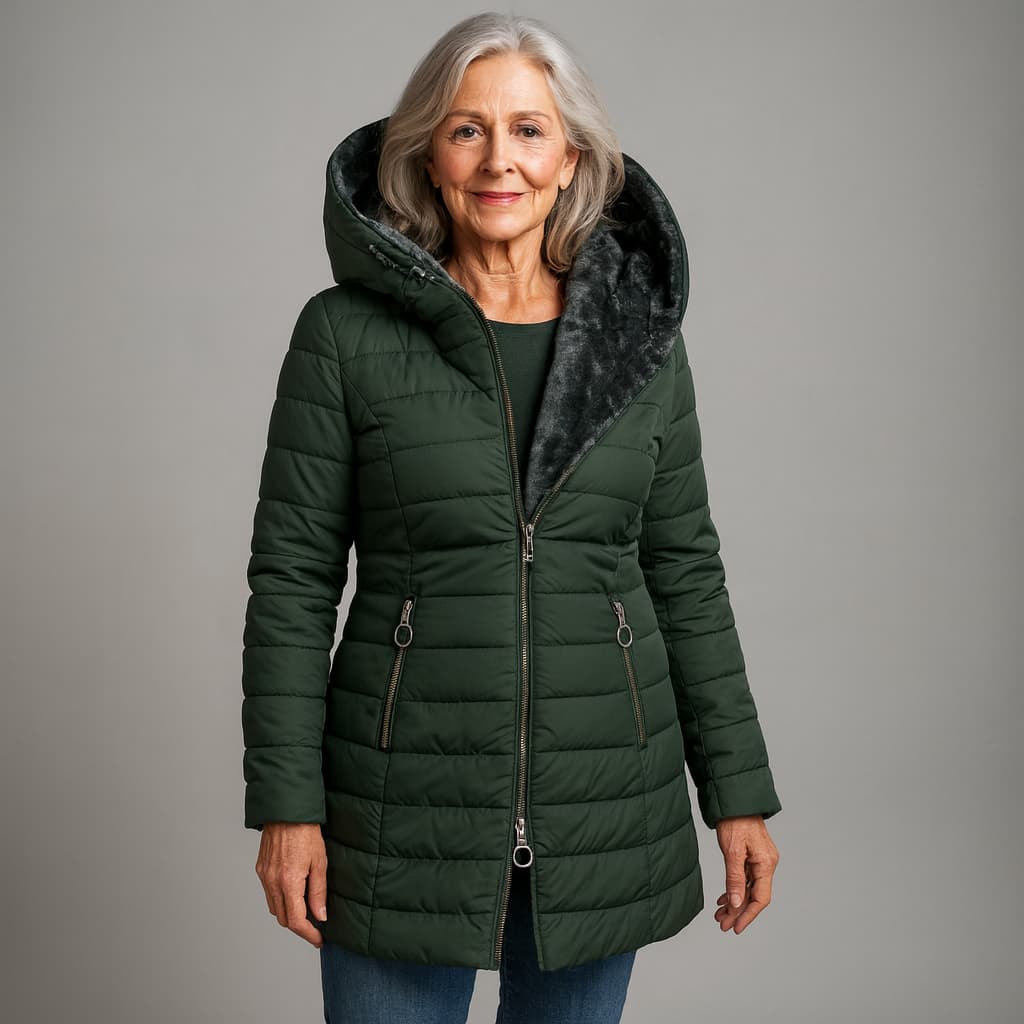 Este abrigo acolchado te envuelve en una calidez suave y lujosa, con un interior afelpado que se siente como un abrazo en los días fríos. La capucha amplia y envolvente protege cuello y escote de forma elegante, mientras el corte estilizado marca la cintura y alarga la silueta sin ceñir. Es esa prenda que te hace sentir arreglada, cómoda y segura de ti misma cada vez que la llevas.