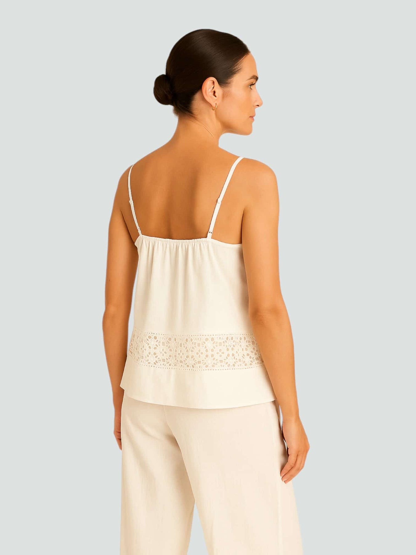 Una combinación ligera y delicada con un aire relajado y femenino. El encaje calado aporta un toque artesanal que eleva el conjunto, mientras la silueta amplia garantiza comodidad sin esfuerzo. Perfecto para días cálidos, escapadas o momentos de calma.