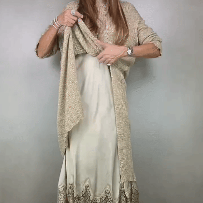 Descubre el equilibrio perfecto entre elegancia femenina y comodidad relajada con este conjunto único de dos piezas. El jersey largo de punto artesanal en suave hilo cae hermosamente sobre el vestido de satén sedoso, creando un look moderno y superpuesto que es tanto sofisticado como fácil de llevar.