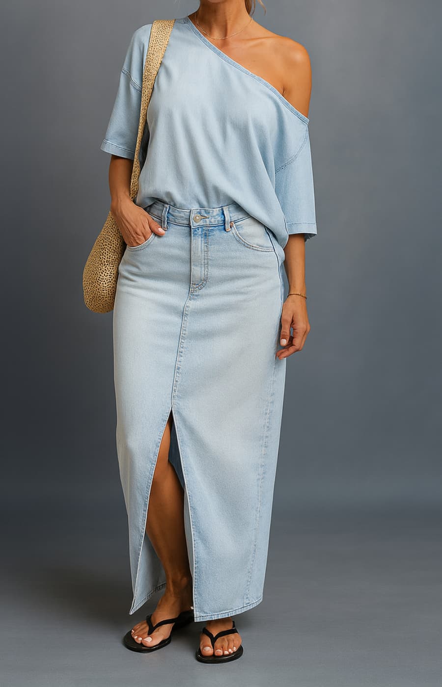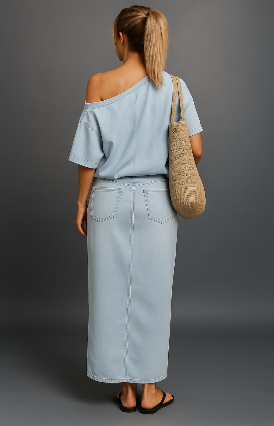 ARIANNA | CONJUNTO VAQUERO CON HOMBRO ASIMÉTRICO Y RAJAS ELEGANTES