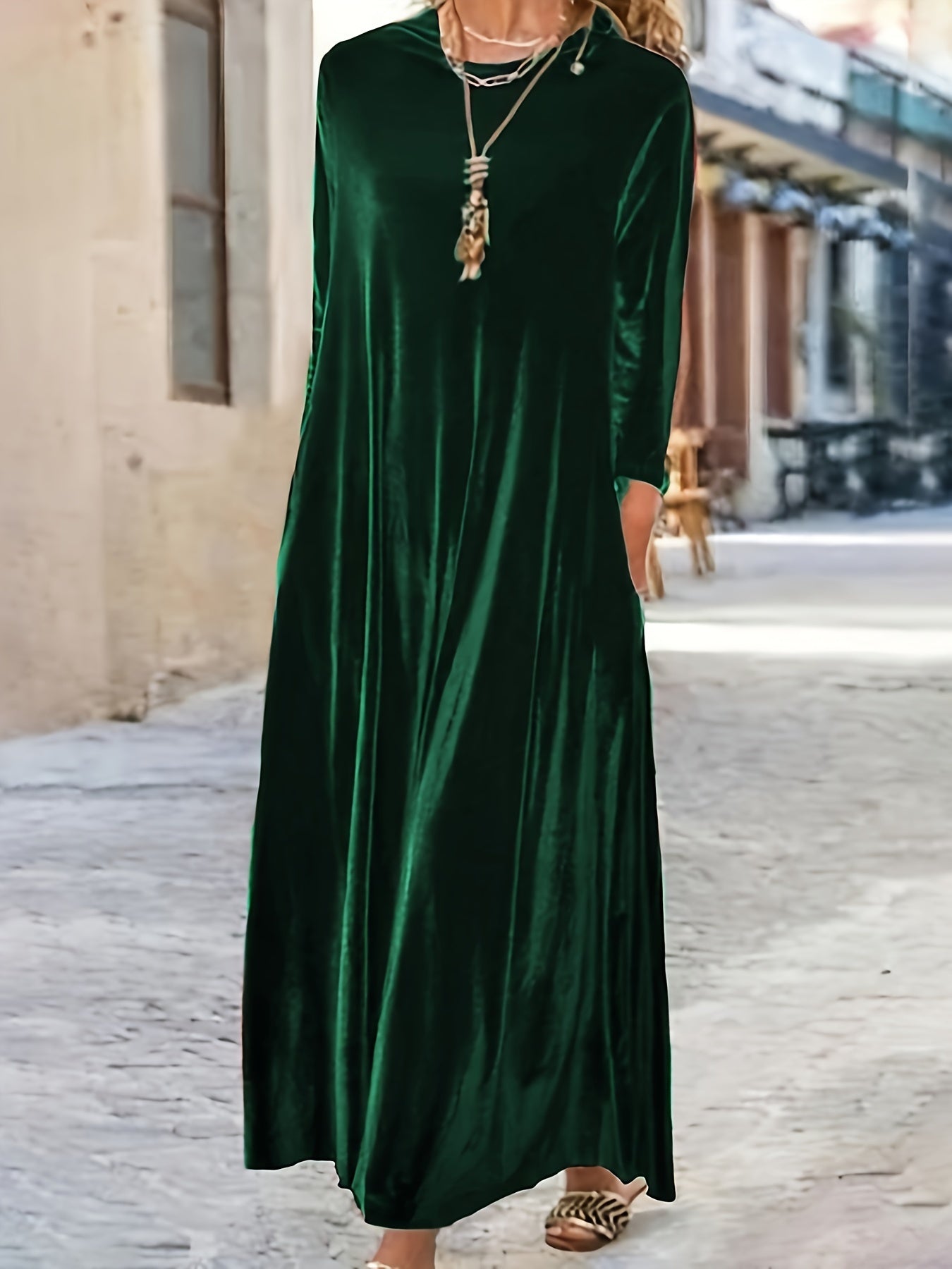 - Diseño: Vestido maxi con cuello redondo favorecedor, mangas tres cuartos que cubren sin apretar, y corte que fluye desde el busto
