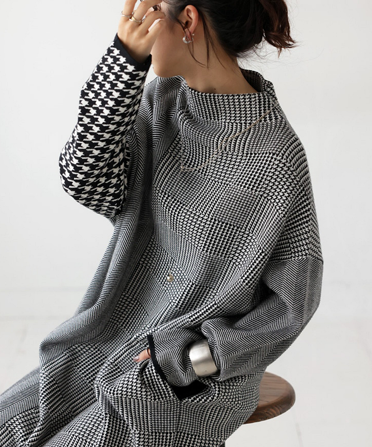 Envuélvase en el lujo del confort sofisticado con este exclusivo Vestido Largo de Punto con Diseño Patchwork Italiano. El diseño de cuello alto y las mangas con elegante detalle de pata de gallo crean una silueta refinada y contemporánea, perfecta para la mujer moderna que valora tanto el estilo como la comodidad.