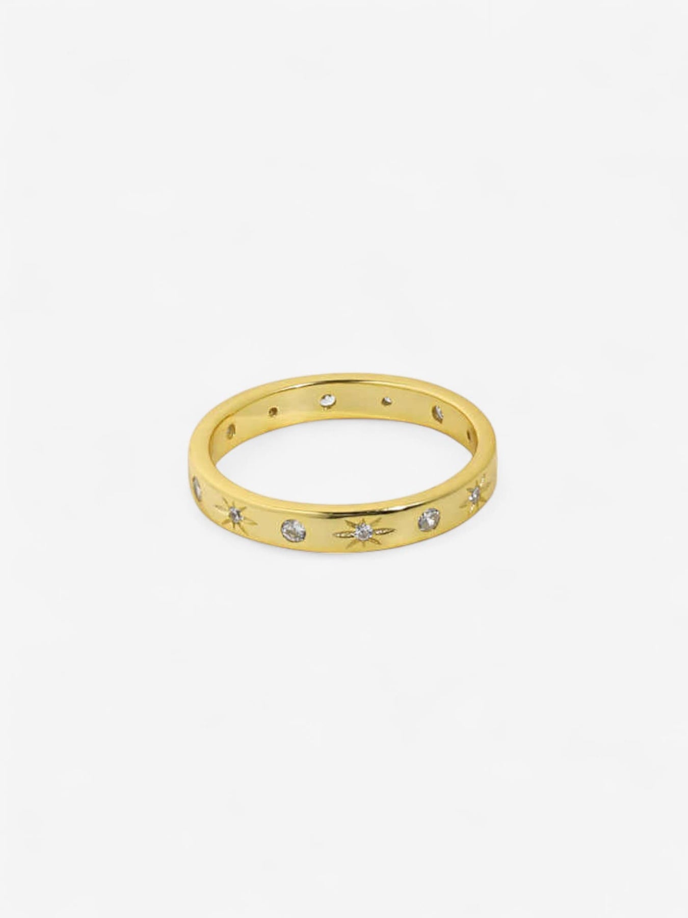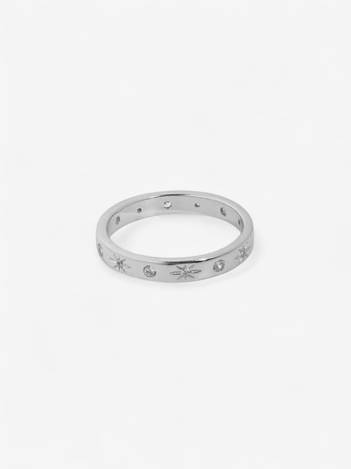 El Anillo Celeste Star Band está diseñado para la mujer que brilla desde dentro — un anillo minimalista de inspiración escandinava, grabado con delicadas estrellas y lunas, cada una engastada con un pequeño cristal brillante.