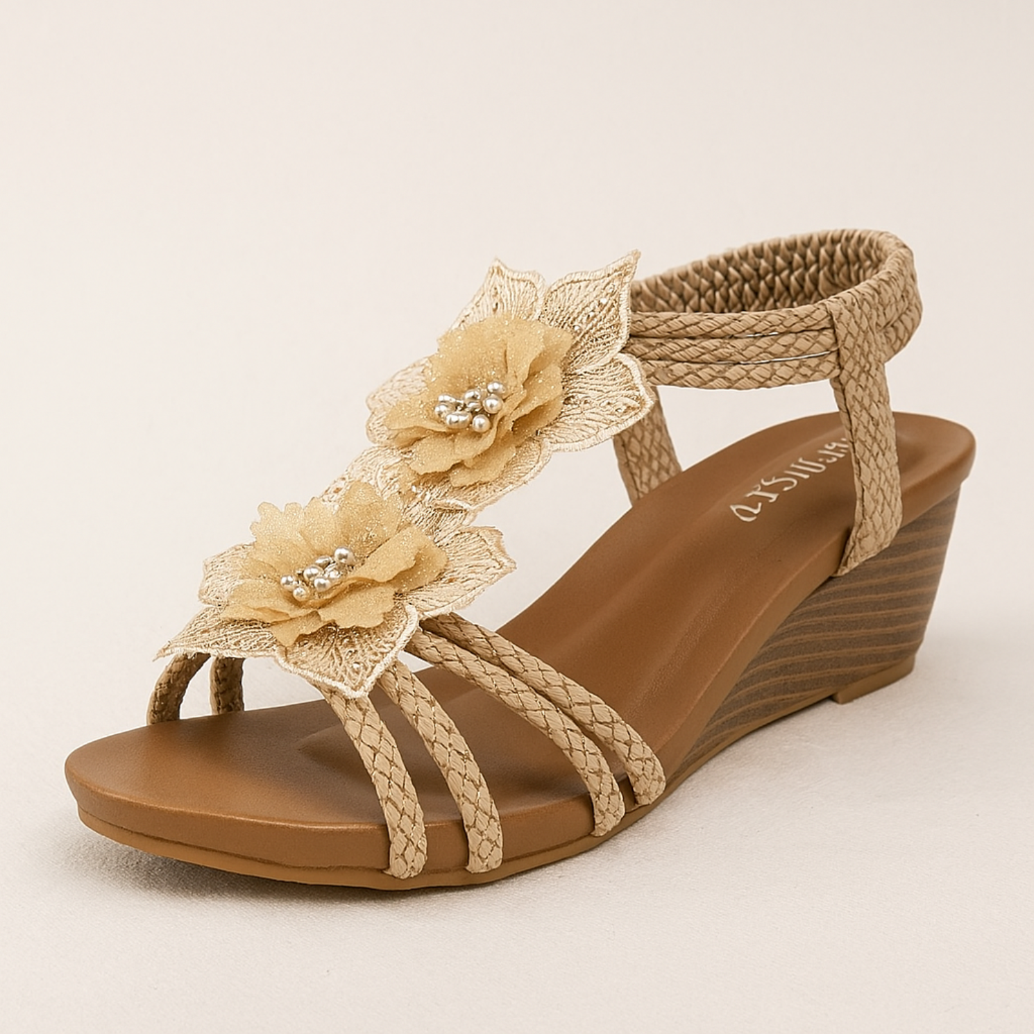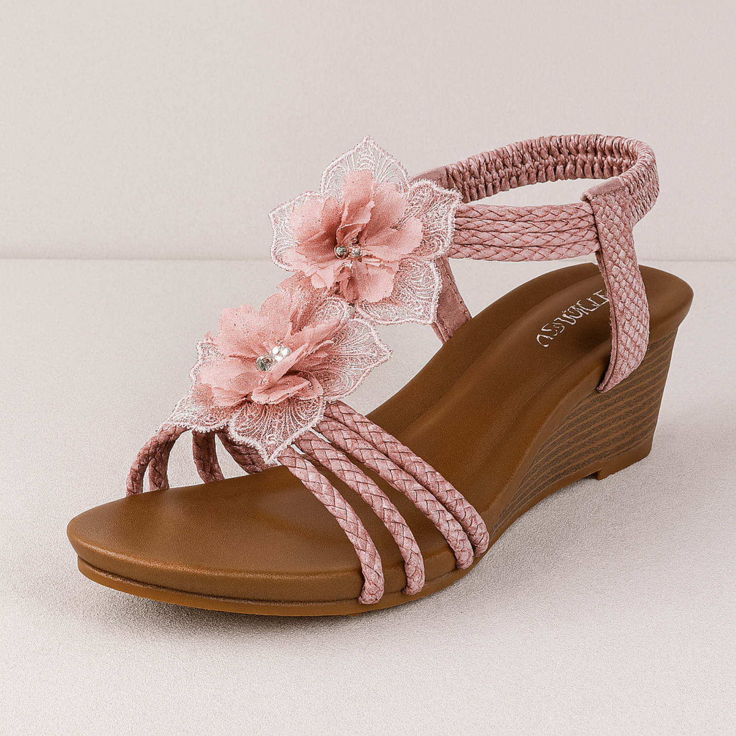 Built-in arch support and a low wedge sole cradle your foot, easing pressure with every step. Braided straps with soft floral accents hold you securely without rubbing. Slip-on design adapts to your pace for all-day comfort.