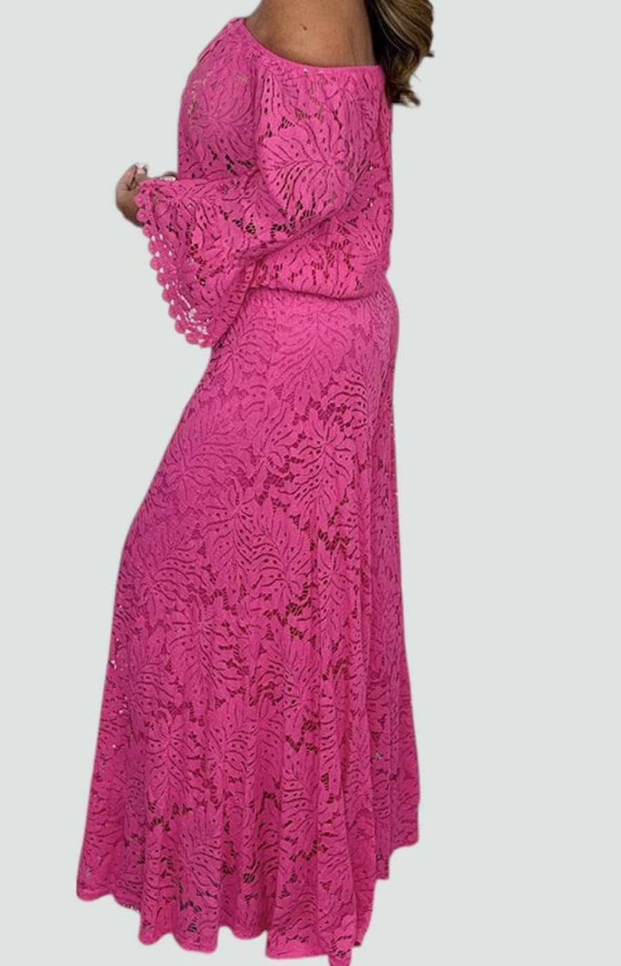 El top de encaje con hombros descubiertos realza el escote de forma sutil y femenina, creando una silueta favorecedora sin esfuerzo.